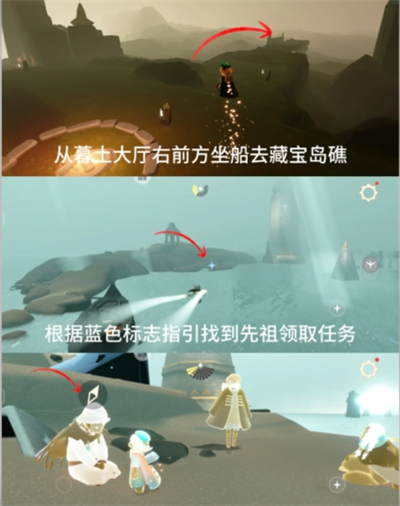 在墓土大厅右手侧乘船前往藏宝岛,根据指引之光,找到先祖后与先祖一同表演即可