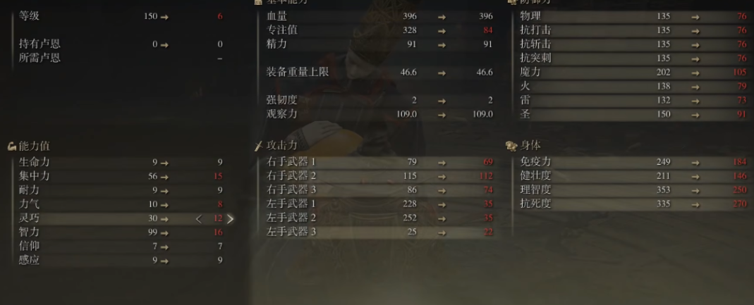 智力80点是法师输出的基准线,达到这个阈值后法术伤害收益会显著降低,此时应优先保障40-50点生命值避免被高周目敌人秒杀,同时将集中力提升至50-60点支撑帚星、彗星亚兹勒等高耗蓝法术的续航需求。灵巧属性建议中期维持在18-22点满足名刀月隐等近战武器的使用门槛,后期可追加至70点优化施法速度,若采用死王子杖则需额外分配24点信仰激活其智信双A补正特性。