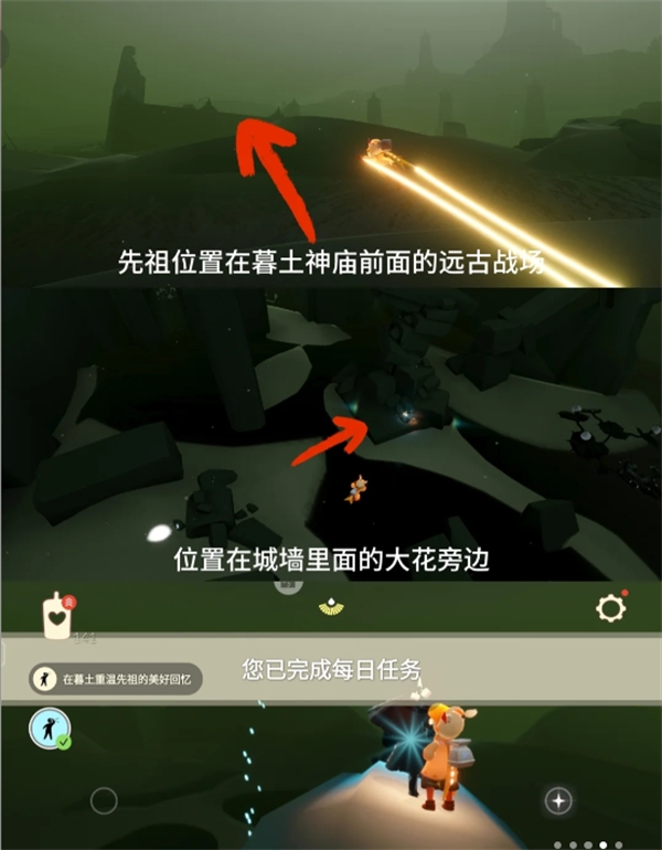 先祖位置在暮土神庙前面的远古战场,在城墙里面的大花旁边