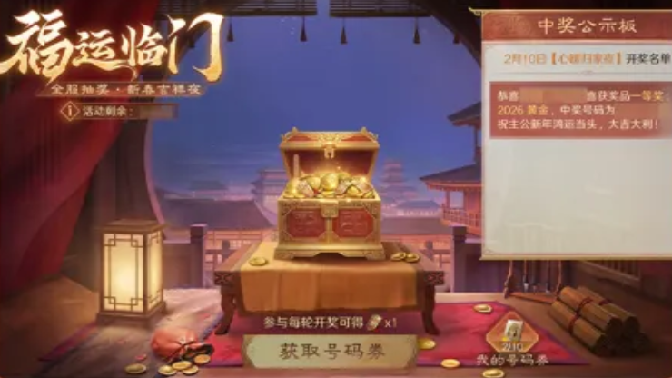 2月10日至3月3日,“百戏游园”与“元夕灯谜”两大玩法开放,玩家通过参与可获取抽奖卷。持有任意数量抽奖卷即视为已加入“福运临门”玩法。中奖号码将于2月17日、2月21日、2月24日及3月3日分批公布,单次最高奖励达2026黄金。