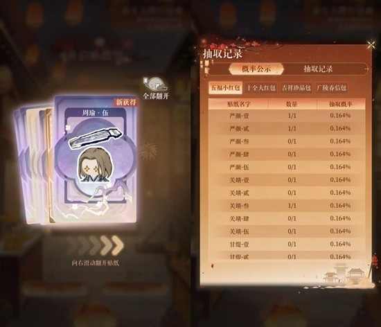 3-2、实体十全大红包内容:每包可开出10 张贴纸,密探贴纸获得机率82.5%,花草贴纸获得机率10%,NPC贴纸获得机率5%,密探羁绊贴纸获得机率2.5%。