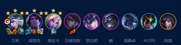 阵容组成:艾希、宝石、索拉卡、月男、猪妹、慎、冰女、卡尔玛、阿狸。