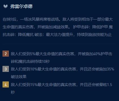 2、3弗雷尔卓德:战斗进行8秒后,释放风暴,敌人受到10%最大生命值的真实伤害并且会被施加35%的破法效果。