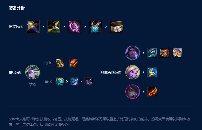 2、主C艾希无尽和火炮必备,第三件装备可以选择巨杀或轻语。