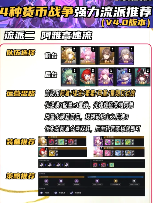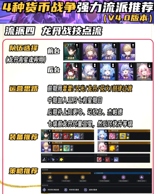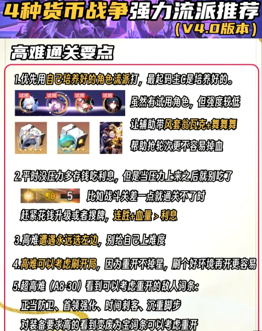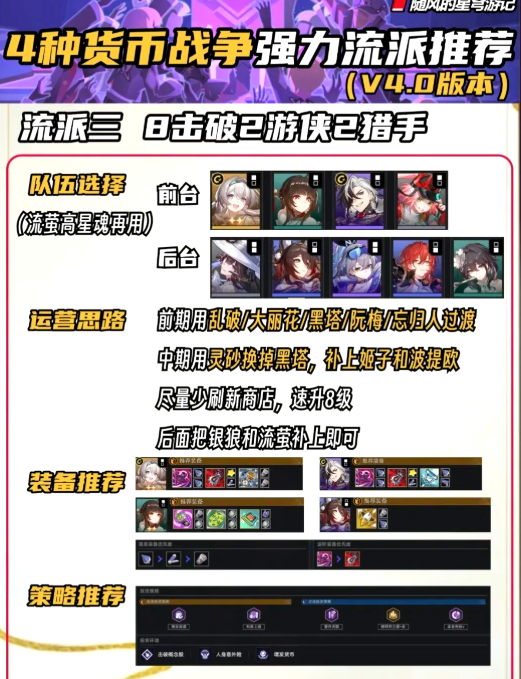 大家早上中午晚上好,我是随风,今天给大家带来的是星铁V4.0货币战争攻略,4种强力流派推荐。想打得比较轻松的优先推荐火花或者阿雅的,只有试用角色也能通关,其他两个最好有2星魂。主要记一下运营思路就好了,装备之类的局内选择高赞的相关攻略应用就可以了,建议选择自己培养好的角色流派打,然后高难度可以考虑刷一下开局再打,降低难度。