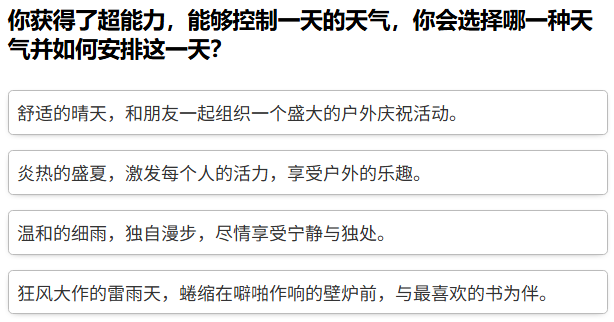 天气个性测验免费版网址入口:https://www.arealme.com/what-kind-of-weather-are-you/cn/