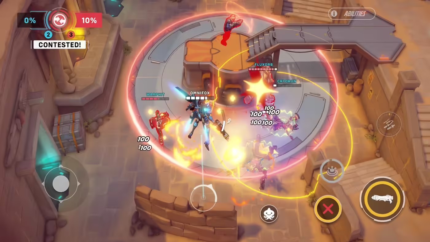 屏幕上同时展示了操作界面,暗示玩家将使用左手控制角色移动,而右手则负责主武器开火和技能按键。从早期的画面来看,游戏采用了不同于《守望先锋》的 4v4 玩法,且节奏似乎更为休闲。
