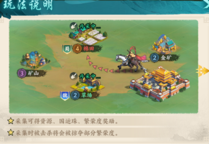 玩法结构分为五大模块,各具功能定位: 第一类为资源采集。玩家在主地图指定区域进行采集操作,可同步获取基础资源、国运珠及繁荣度三项收益。需特别注意——采集过程中若遭遇敌对玩家攻击并被击败,将损失部分已积累的繁荣度,因此建议优先选择安全时段或组队协同作业。