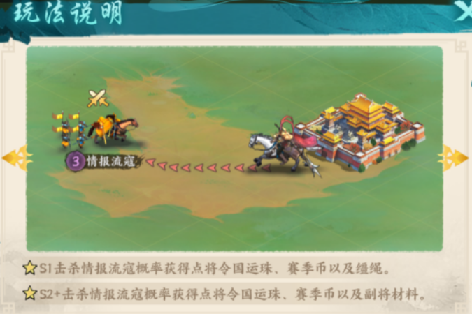 第二类为情报流寇讨伐。S1赛季中,成功击杀流寇可稳定掉落点将令、国运珠、赛季币及缰绳;进入S2赛季后,缰绳调整为副将培养材料,其余掉落保持不变。该环节产出效率高、耗时短,建议每日定时完成多轮清剿。