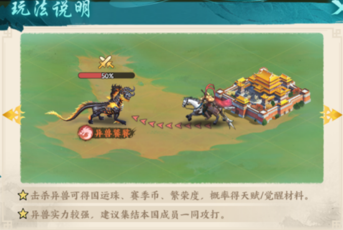 第三类为异兽围猎。该目标具备较高战斗难度,单人挑战成功率极低。其掉落涵盖国运珠、赛季币、繁荣度,并有概率获得角色天赋材料或觉醒材料——这两类均为角色进阶关键资源。推荐以本国联盟为单位组织集结作战,显著提升通关效率与战利品获取稳定性。