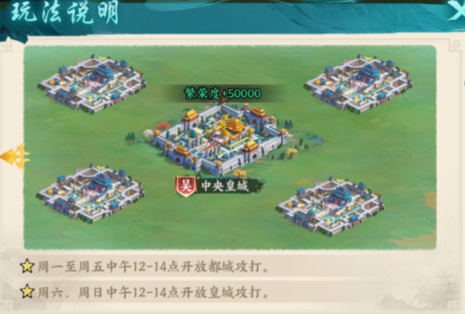 第四类为跨国家城池攻防。该玩法分为两个阶段:周一至周五12:00–14:00开放别国主城进攻权限,获胜方有权掠夺对方一定比例的繁荣度,且被摧毁主城将在地图随机位置再生;周六、周日同一时段则升级为皇城争夺战,属全服级战略对抗,参与规模更大、奖励更丰厚,是赛季积分与稀有资源的重要来源渠道。