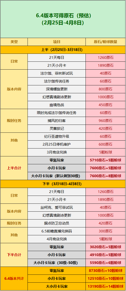 原神6.4月之五版本在2月25日更新上线,新卡池角色,新活动上线,这次的版本时间一共42天,原石的获取相对于之前减少了不少,以下是对原石的获取预估统计,玩家可以参考。