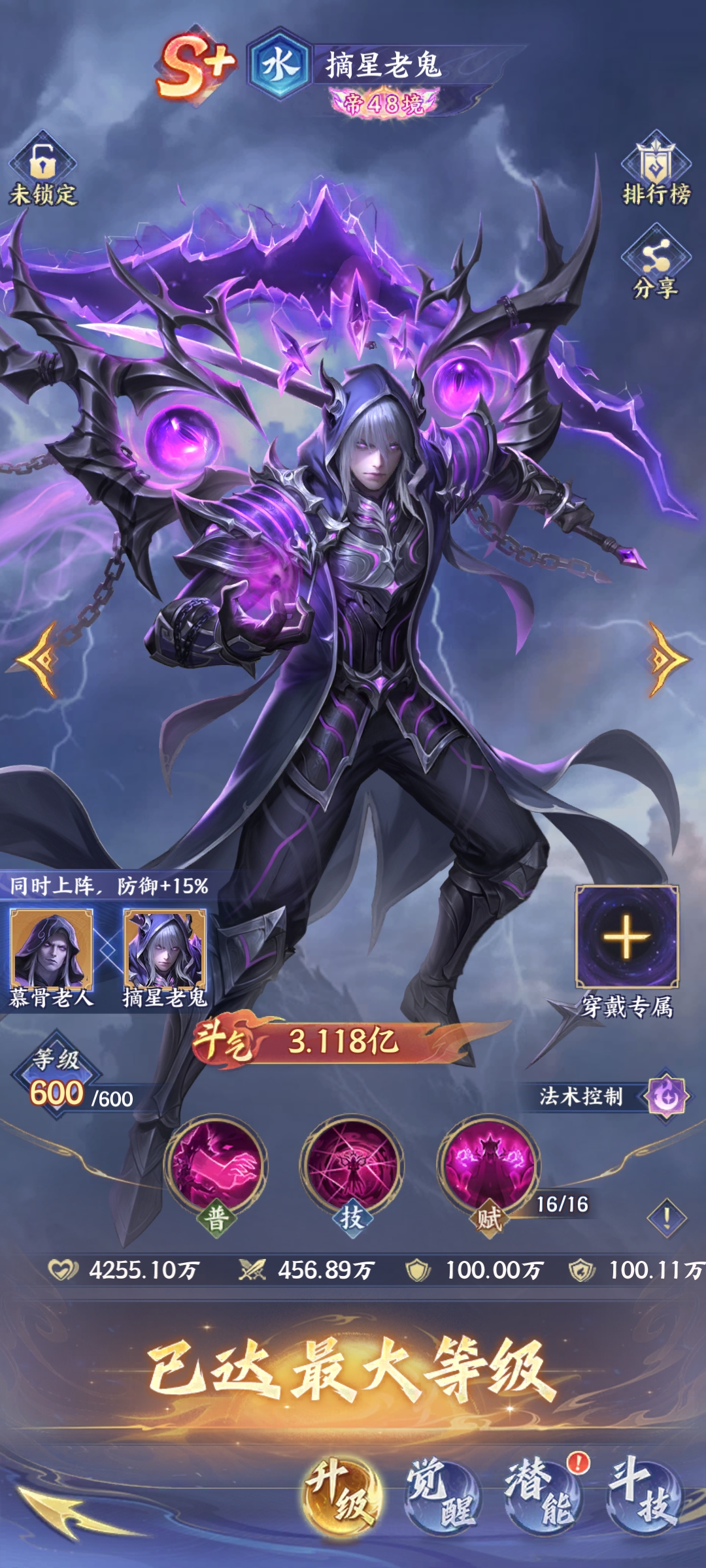 摘星老鬼核心的技能就是空间锁,可以针对敌方全体造成大概90%的伤害,另外还会有60%的概率给目标直接挂一层,持续两回合的空间锁。这一层debuff还是比较关键的,敌方在获取怒气时,就会有20%的概率让怒气减半,直接就会打乱对方开大招的节奏,从根源上就能限制对方的技能输出。而且他和慕骨老人之间还有羁绊效果,如果两个人可以同时上阵,就可以给整个队伍带来15%的防御,坦度就可以提升一个档次。