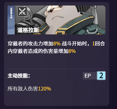 道格拉斯拥有1个被动技能与1个主动技能。被动【护卫】提供双重增益:一是使装备者自身获得8%攻击力加成;二是在每场战斗开始时,提升责任主战员全阶段造成的总伤害8%。该效果无需操作触发,属稳定前置增伤,对依赖首回合爆发的主C阵容尤为关键。主动技能【巨型火箭筒】消耗2点EP释放,可使当前回合内我方全体攻击对敌人造成的伤害提升120%。需注意,此增幅作用于所有敌方单位,具备明确的AOE强化属性,适用于清杂兵或压制Boss阶段的多段血线。