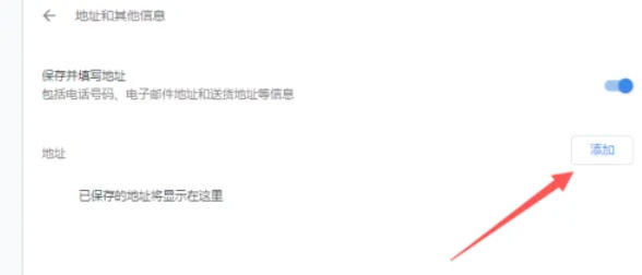5、在「自动填充」选项下,找到 「地址和更多」(或直接显示为「地址」)部分。点击右侧的 「添加」 按钮(通常为蓝色按钮或「+」图标)。