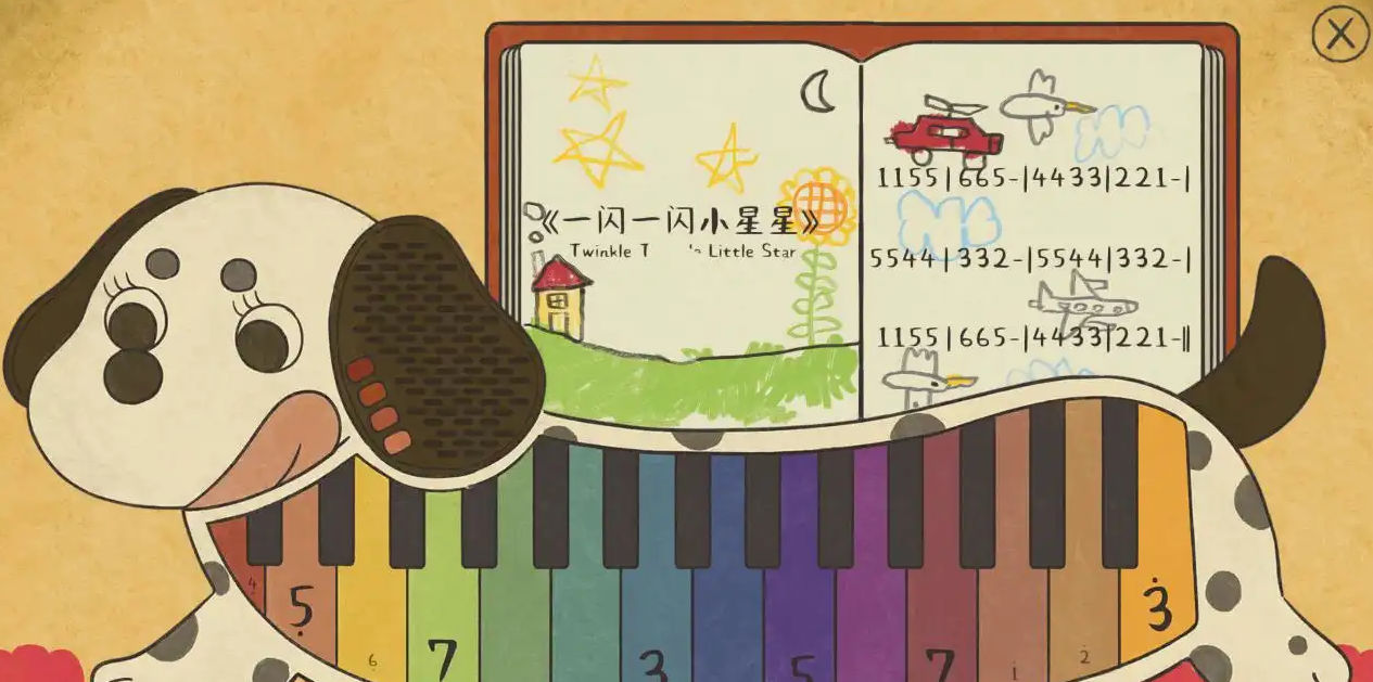 ③ 回桂安家属区找到小狗电子琴,点击琴谱右侧翻到第二页并按照曲谱弹奏《一闪一闪小星星》