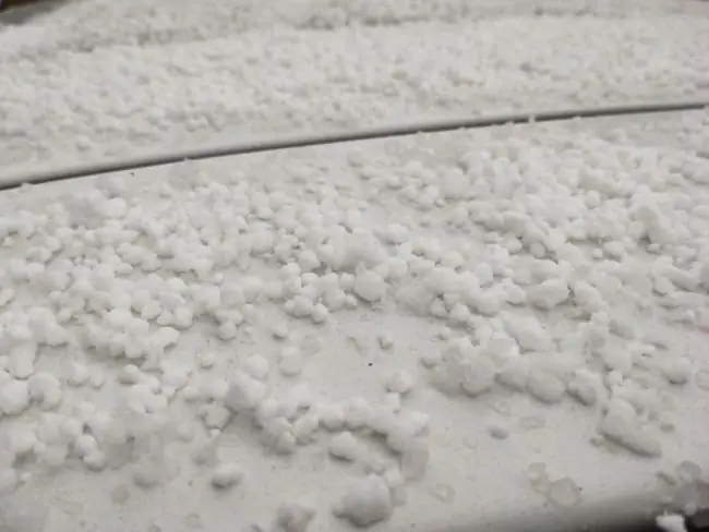 “霰”是一种在冬季或冷空气影响下出现的白色、不透明的圆锥形或球形固态降水,直径通常在之间,结构松脆易碎。它是高空过冷水滴冻结在冰晶上形成的,通常在降雪前或降雪时出现,落地后容易碎裂。