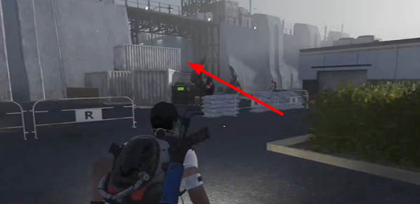 2、走到下图位置后,在左侧会有一个厂房建筑,玩家要顺着建筑的楼梯来到房顶位置,这里会有宝箱;