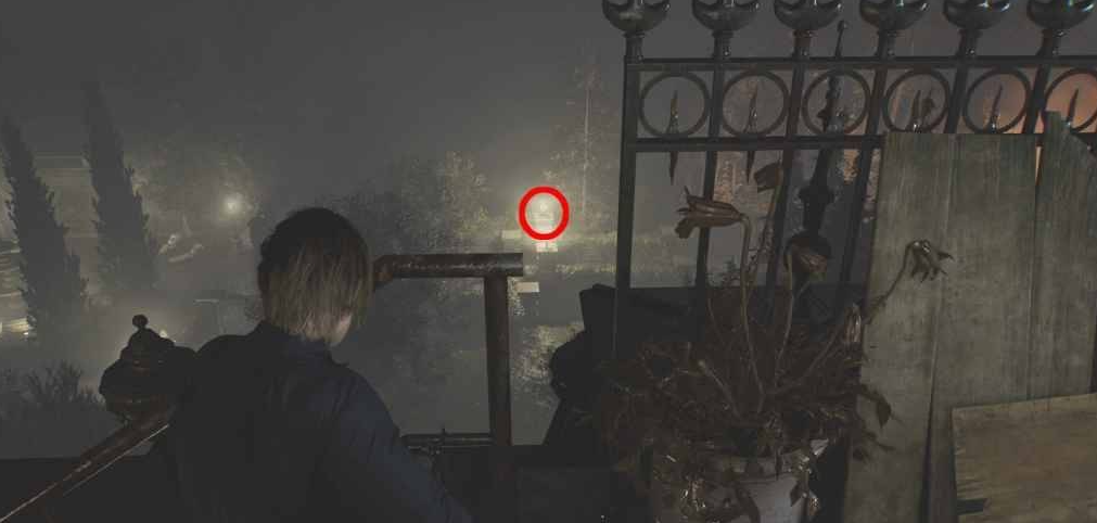 走到楼梯顶部但不要穿过木门,在楼梯处左转,往下瞄准庭院区域亮灯的地方