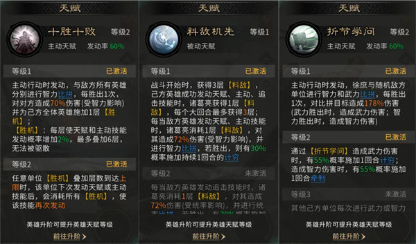 诸葛亮的天赋【料敌机先】,当敌方发动天赋或主动技能时,诸葛亮消耗1层【料敌】,造成伤害并进行智力比拼,胜出则概率施加1回合计穷;若敌方发动追击技能,消耗1层【料敌】造成伤害并进行统率比拼,胜出后概率施加1回合牵制。