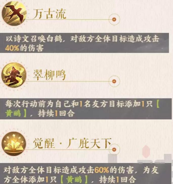 李白,杜甫战斗开始时,李白获得【黄鹂】一只,持续1回合。