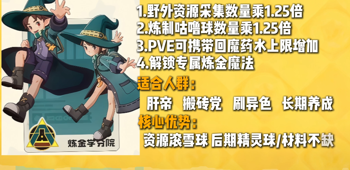 炼金学分院聚焦资源转化效率。其炼制产出为基准值的1.25倍,涵盖精灵球及野外基础材料;同时开放专属炼金魔法,支持定向合成高价值道具。该分院属于中后期成长型路线:前期受限于材料匮乏,优势不显;但进入中期后,随着副本资源量上升,炼金倍率带来的复利效应将大幅加速养成进度。