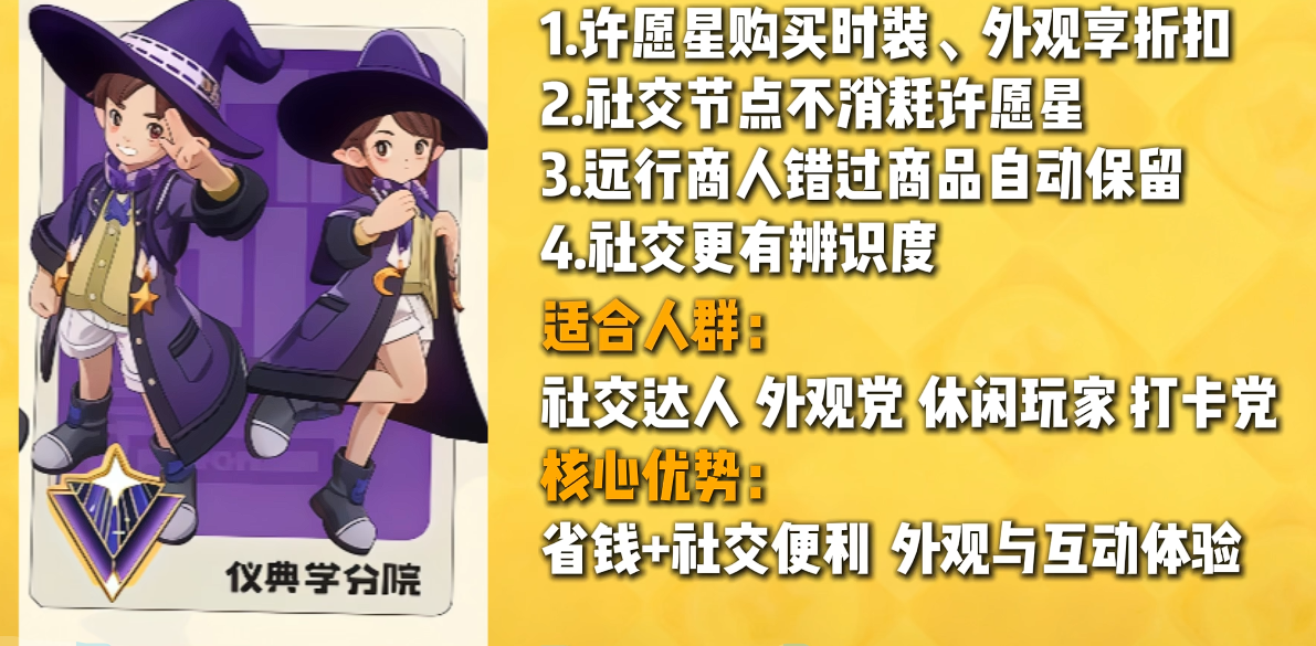 仪典学分院侧重社交与外观系统。玩家通过许愿星兑换时装时可享受额外折扣,且参与节日活动、组队互动等社交行为无需消耗额外金币或绑定资源。该分院无战斗或养成数值加成,但能显著优化视觉体验与轻度社交成本,适合重视角色个性化表达及社区互动的玩家群体。