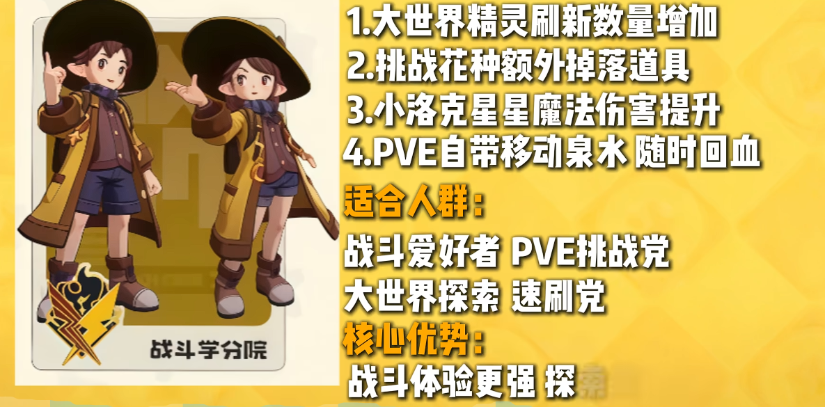 战斗学分院围绕实战强度构建能力体系。其特性包括:野外精灵刷新密度提升、挑战地区花种采集资源量增加、野外状态下自动恢复生命值,以及专属星星魔法附带额外伤害加成。该分院在PVE推进速度与PVP对抗稳定性方面表现突出,是追求高效清图、高难度副本攻坚及竞技场表现的玩家首选。