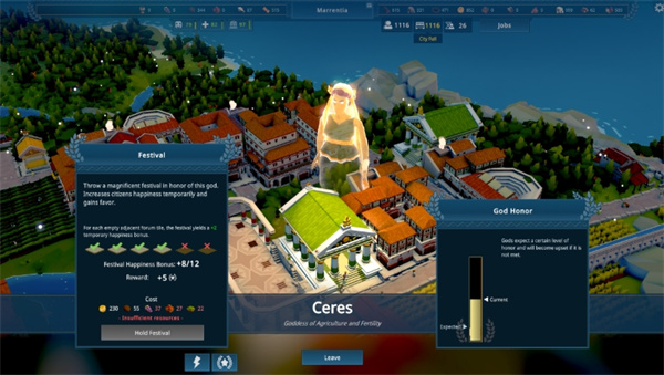 最后,你需要考虑上帝的荣耀,这是衡量他们满意度的一种指标。落入“预期”状态,众神会开始对你发怒,这可能导致你的城市遭遇灾难。建造神庙——尤其是大型和宏伟神庙——将有助于提升当前等级以满足需求。