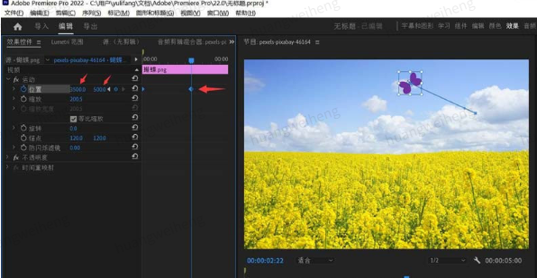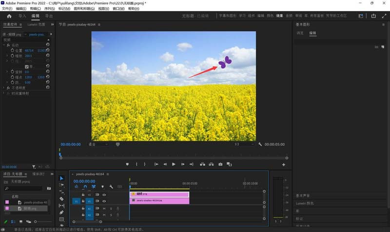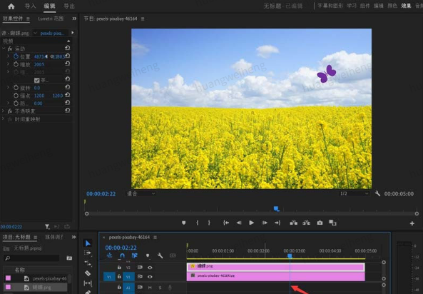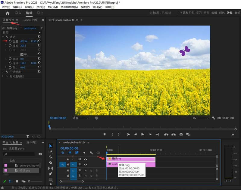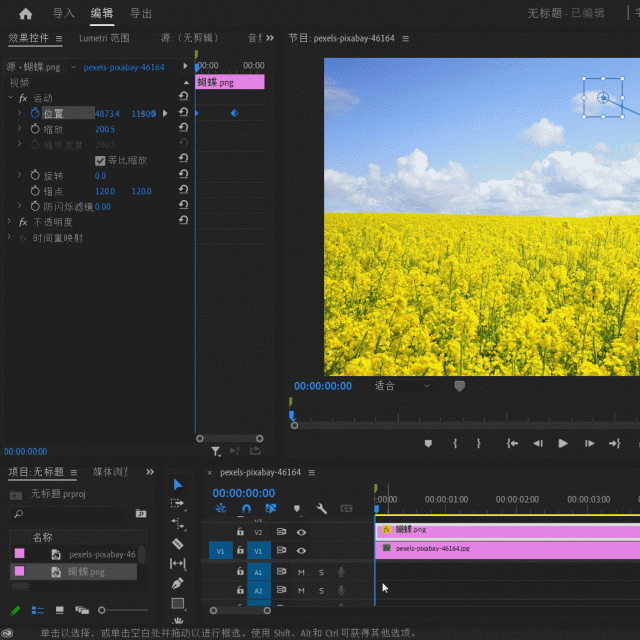 下图所示的PR项目文件中,有2个素材,一个是油菜花图片(上方为蓝天白云),另一个是紫色蝴蝶图片。接下来我们要为蝴蝶制作一个向左上方向飞动的动画。