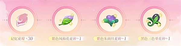 礼包内容:30周年庆代币+1颗紫色凤仙花种子+1颗黑色三色堇种子+1颗紫色朱顶红花种
