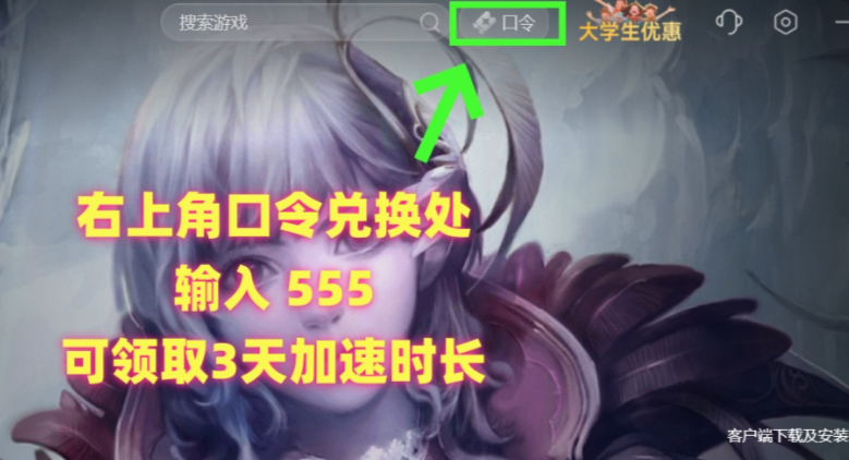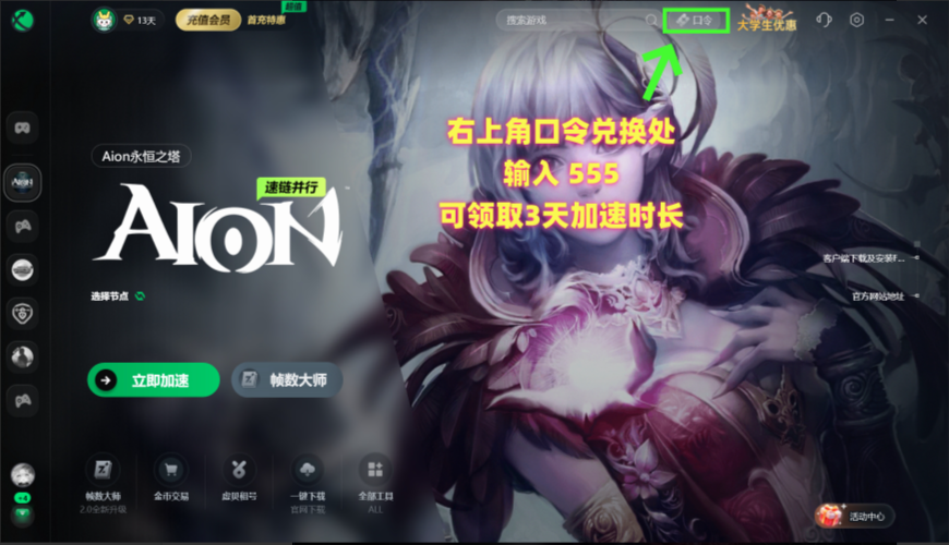 通过口令兑换功能输入特定代码【555】,可免费获取3天加速时长的会员权益。