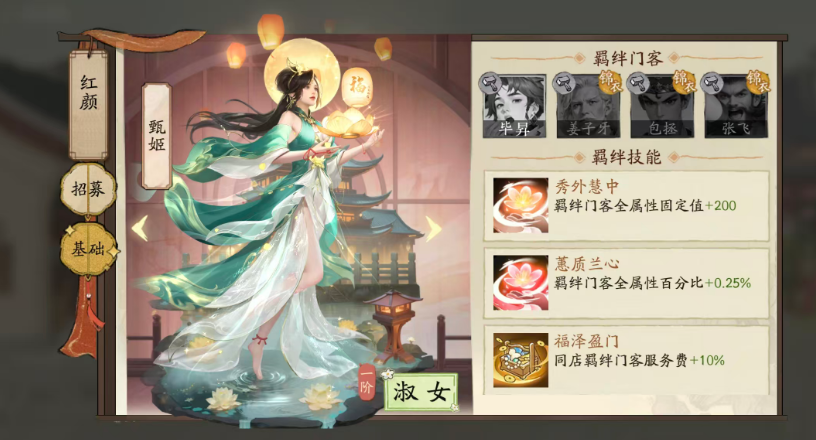 甄姬当前一阶(淑女形态)拥有三项专属羁绊技能:其一为“秀外慧中”,可使所有羁绊门客的基础属性各提升200点固定数值,覆盖攻击、防御、智力、魅力等全维度,适配不同门客的成长侧重;其二为“蕙质兰心”,在存在任一指定羁绊门客时,为全体门客提供全属性0.25%的百分比加成,虽单次增幅有限,但叠加门客自身天赋及多红颜协同后,长期累积收益可观;其三为“福泽盈门”,当羁绊门客在店铺中担任职务时,可额外提升其服务费收入10%,直接强化核心经济循环。