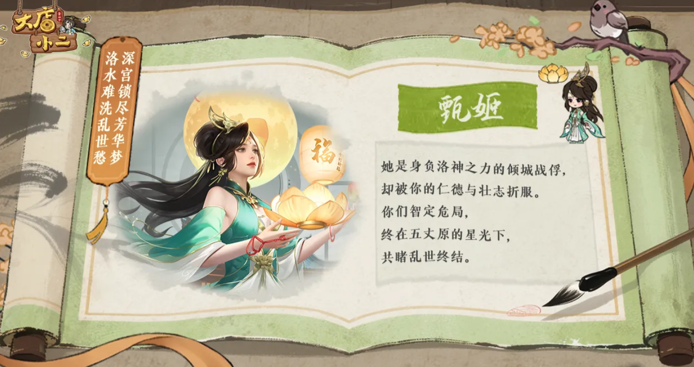 在《大店小二》这款经营模拟类手游中,门客系统固然构成前期发展的核心驱动力,但随着游戏进程推进,红颜角色的战略价值日益凸显。作为章节主线剧情的重要组成部分,每位红颜均对应特定章节的女主身份,需通关对应主线后方可解锁并纳入内宅系统。其中,“洛水神女”即为甄姬的专属称号,是游戏中第九章正式开放的红颜角色,属于中后期关键养成目标。