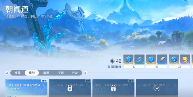 开局时跟着引导提升到6级,然后进入到地下世界避难所。大厅怪物时务必要拿走黄色水晶处的钥匙,因为后续在做任务时必须要使用。在跑图的过程中解锁所有的传送点就可以获得经验,提升到8级时就会暂时卡住任务。等到11级的时候解锁主线后就应该优先去完成朝闻道日常任务。接着玩家还需要去挑战8级蛮虎,将这个boss打败之后就能获得首通奖励,然后还可以搭配拍照等休闲玩法,可以凑满120点活跃值。