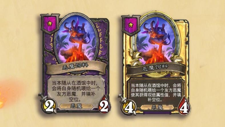 恶魔体系迎来深度拓展,“恶魔饲料”成为全新交互要素。该机制表现为一种出现在酒馆中的即时吞噬型资源,需通过特定恶魔随从触发生成。例如二本随从“恶魔实验助理”,其战吼效果可在接下来的三次酒馆刷新中,每次各添加一枚恶魔饲料。配合饰品如“亵渎者肖像”,可进一步放大饲料所转化随从的身材成长空间。