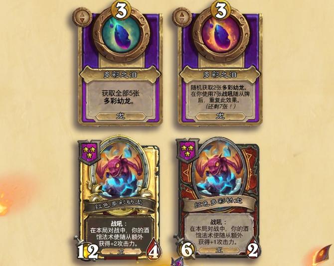 龙族阵营同步引入“多彩幼龙”机制,功能定位接近现环境中的扩音机,但具备更丰富的策略分支。总计5种不同属性的多彩幼龙可供选择,分别提供法术伤害加成、攻击力与生命值双增、龙族专属攻血强化,以及随机获得一张消耗2枚铸币的酒馆法术卡牌。相关饰品如“多彩之泪”亦已实装,进一步拓展龙族构筑深度。