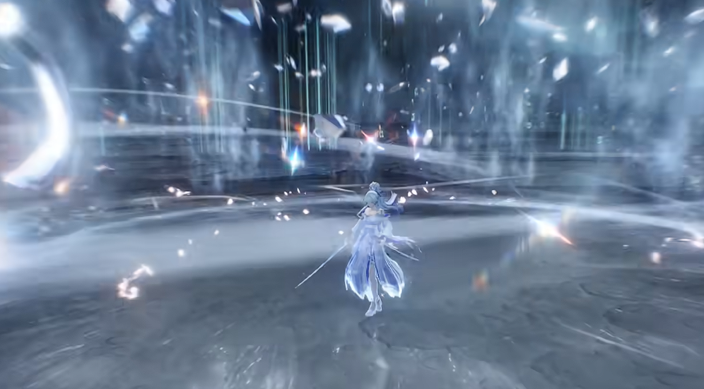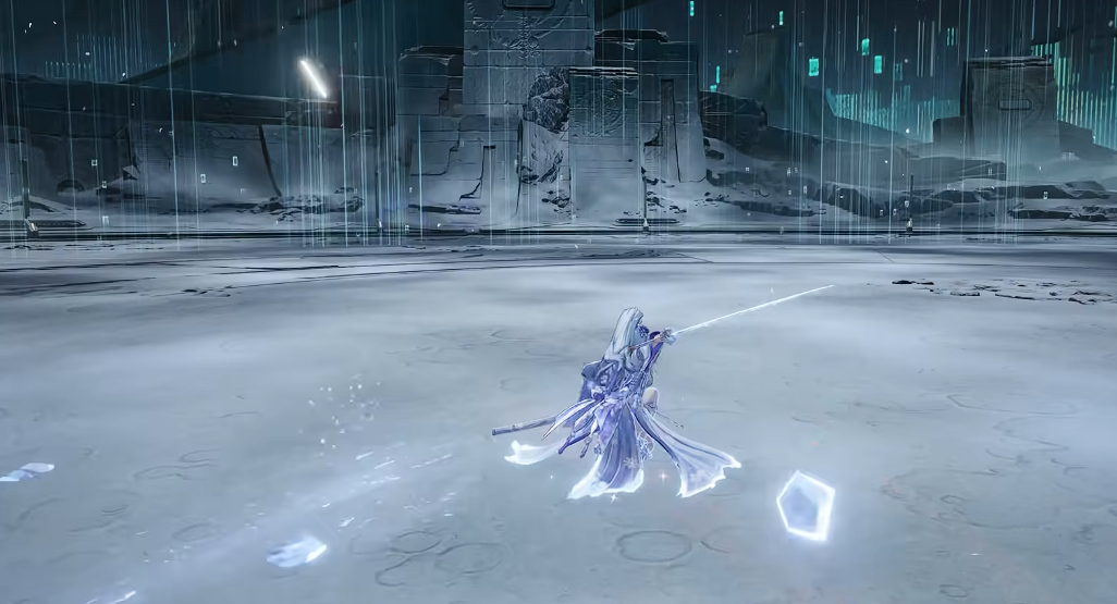 其终极技能为「霜魄临界」,开启后进入冰雪强化状态。期间所有攻击附加冰属性伤害,并额外生成多段冰山坠击,对大范围目标造成高频AOE。技能全程释放速率快、动画帧数紧凑,可持续维持高爆发输出节奏;终结技为收刀式斩击,拥有全技能中最高的基础倍率,兼具视觉表现与实战杀伤力。