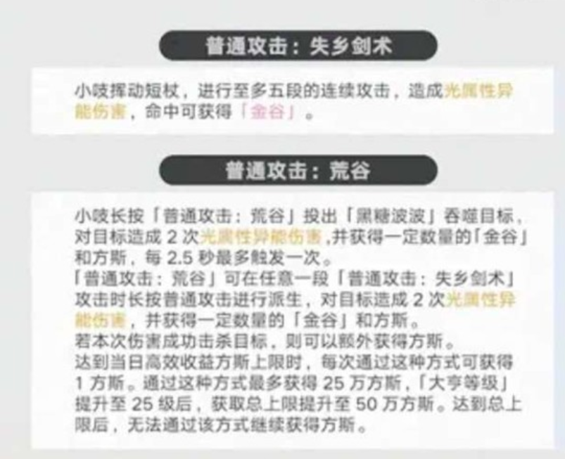 小吱的基础输出循环由三类普攻形态构成:首段为五连击「失乡剑术」,每次命中均触发光属性伤害,并稳定获取1点金谷。该技能是整套循环的启动节点,也是资源积累最可控的起点。新手需重点训练节奏感与命中稳定性,确保五段全部命中,为后续技能派生打下基础。