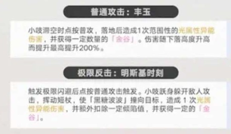 小吱具备空中普攻触发机制:滞空状态下点击普攻将发动「丰玉」,角色下坠并对落地点周围大范围目标施加光属性伤害。伤害随下落高度递增,最高可达基础值的2倍,兼具清场效率与战术位移价值,适用于群怪压制与地形压制场景。