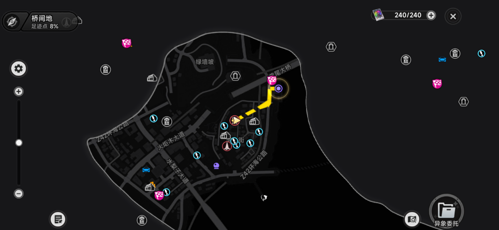 除主线委托板块外,《异环》地图中还存在大量未标记的隐藏异象。玩家可通过“区域探索度”系统查看当前地图尚存异象数量,结合异象雷达信号强度变化(如图标脉动频率、颜色饱和度梯度),即可精准锁定潜在目标位置,实现高效率清图与经验积累。