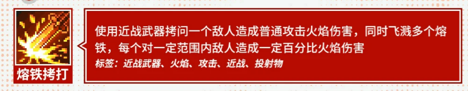 主动技能方面,“熔铁拷打”为基础近战强化技:使用近战武器命中单个目标后,除造成直接火焰伤害外,还会向四周溅射多枚熔铁碎片,落地即触发小范围火焰爆炸,实现“点杀+溅射”双重打击效果,显著提升清怪效率与站桩容错率。