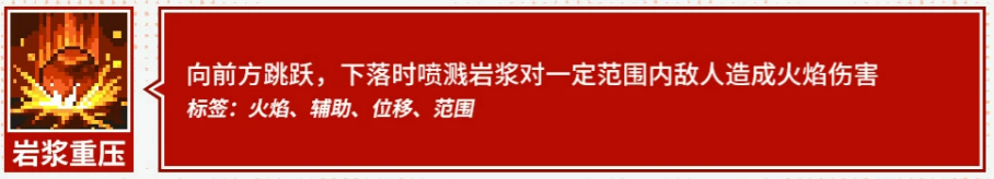 “岩浆重压”为突进型位移技:向前方跃击并重砸落地,瞬间在落点区域喷发岩浆,对范围内所有敌人造成火焰伤害。该技能兼顾机动性与AOE输出,既可切入敌阵核心,亦可在被围时快速反制,实战中具备较高战术自由度。
