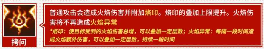 被动技能“拷问”重构普攻逻辑:每次普通攻击附加固定火焰伤害,并为目标施加一层烙印;烙印最大叠加层数获得提升;关键调整在于——该火焰伤害不再触发火焰异常状态,从而规避异常判定对输出连贯性的干扰,确保伤害输出更线性、更可控。