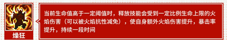 “躁狂”属条件增益型被动:当角色当前生命值高于设定阈值时,每次释放技能将扣除一定比例已损失生命值,但同步提升火焰伤害与暴击率。该机制要求玩家主动调控血量区间,配合火焰抗性属性可降低实际损耗,形成“以血换伤”的高风险高回报战斗风格。