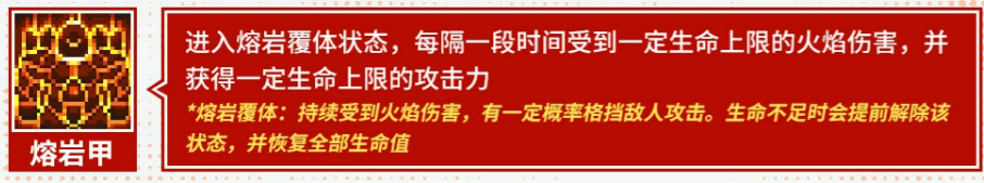 辅助技能“熔岩甲”赋予状态化作战形态:激活后进入熔岩覆体状态,期间每秒承受基于当前生命上限一定比例的火焰伤害,同时攻击力依据最大生命值提升;拥有概率格挡机制;若生命值低于临界值则状态提前终止,并立即恢复至满生命值,构成兼具输出与保底的复合型生存手段。