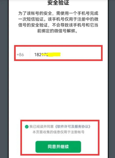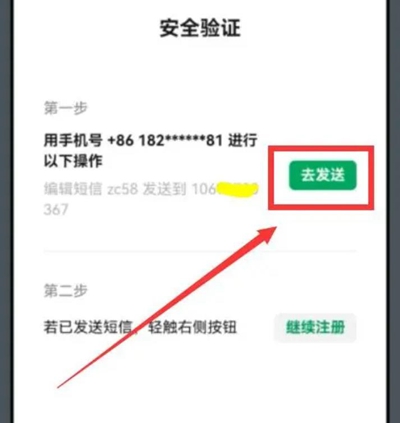 7、接着我们输入手机号,然后点击“去发送”微信会自动发送一个“zc58”的短信给微信官方去验证,然后我们完成短信验证之后点击下方的继续注册。(我可以选择当前手机号或新的手机号,这里只是辅助验证)