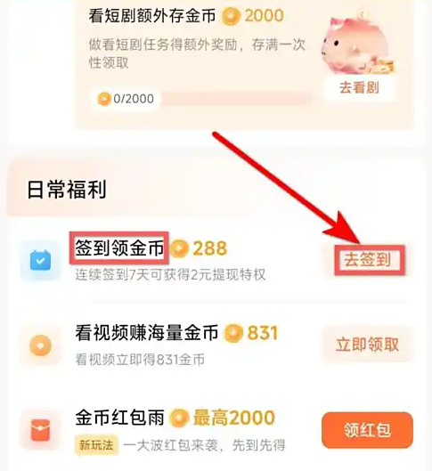 在红果免费短剧APP中,您可通过签到轻松获得金币:首先进入首页点击【福利】,随后在福利页面找到“签到领金币”并点击右侧【去签到】,最后在签到页面点击【立即签到】即可完成当日金币领取。