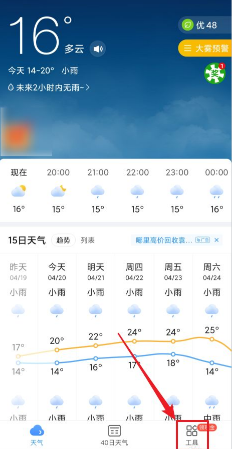 在2345天气王中查看历史天气,可先打开应用,点击右下角“工具”按钮,在“工具”页面的“常用功能”下,点击“历史天气”,打开该页面后,即可查看到当地的历史天气记录,也可根据个人需要选择特定日期查看。