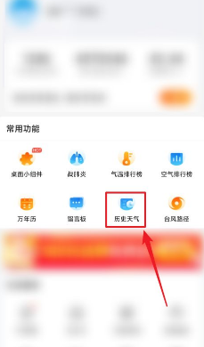 2、在“工具”页面“常用功能”下,点击“历史天气”。见下图